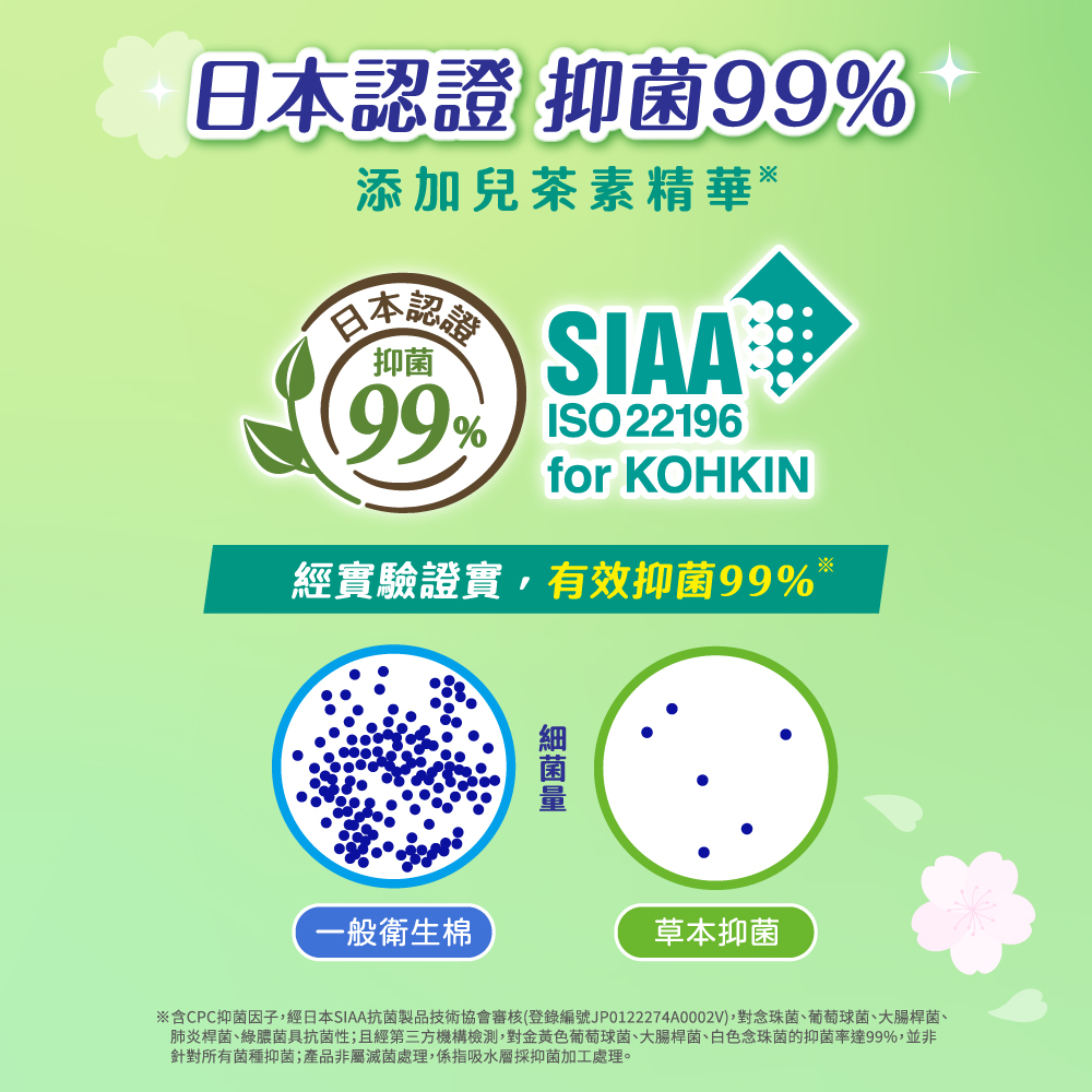※含CPC抑菌因子,經日本SIAA抗菌製品技術協會審核(登錄編號 JP0122274A0002V),對念珠菌、葡萄球菌、大腸桿菌、肺炎桿菌、綠膿菌具抗菌性;且經第三方機構檢測,對金黃色葡萄球菌、大腸桿菌、白色念珠菌的抑菌率達99%;產品非屬滅菌處理,係指吸水層抑菌加工處理。
