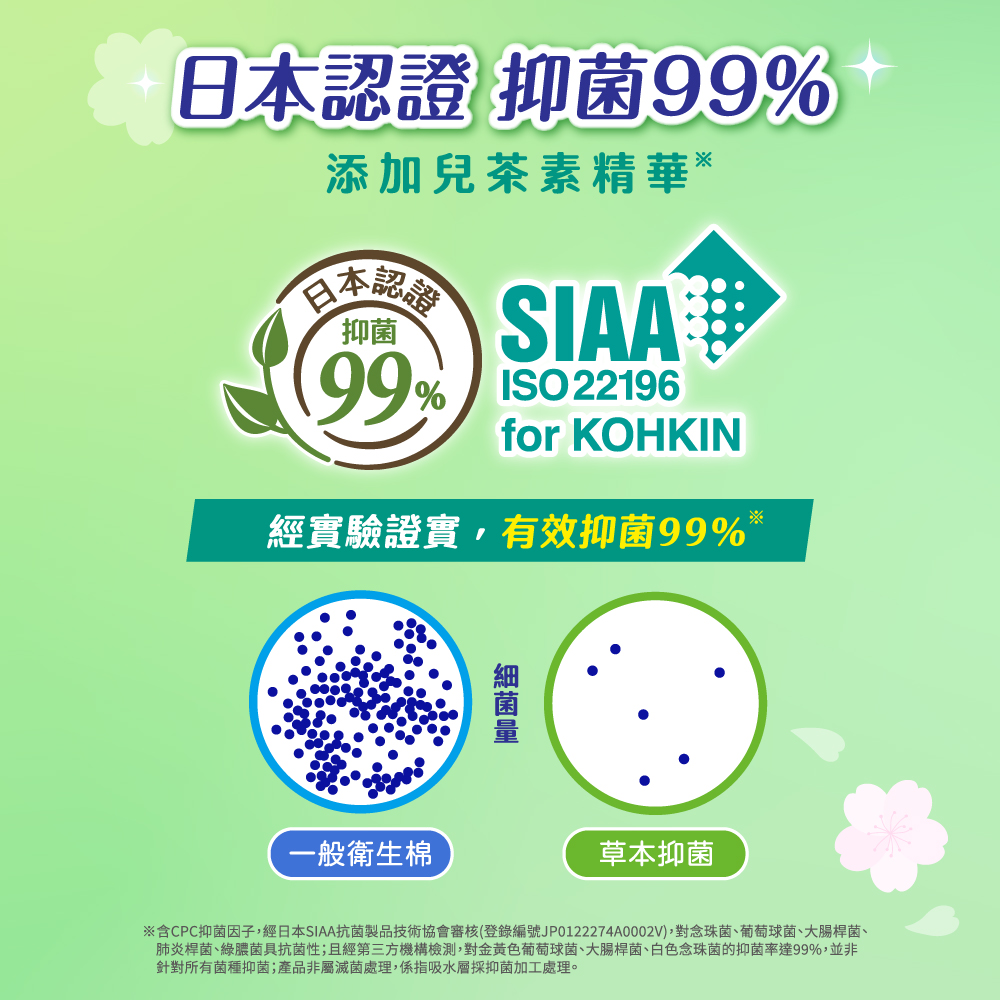 ※含CPC抑菌因子,經日本SIAA抗菌製品技術協會審核(登錄編號 JP0122274A0002V),對念珠菌、葡萄球菌、大腸桿菌、肺炎桿菌、綠膿菌具抗菌性;且經第三方機構檢測,對金黃色葡萄球菌、大腸桿菌、白色念珠菌的抑菌率達99%;產品非屬滅菌處理,係指吸水層抑菌加工處理。