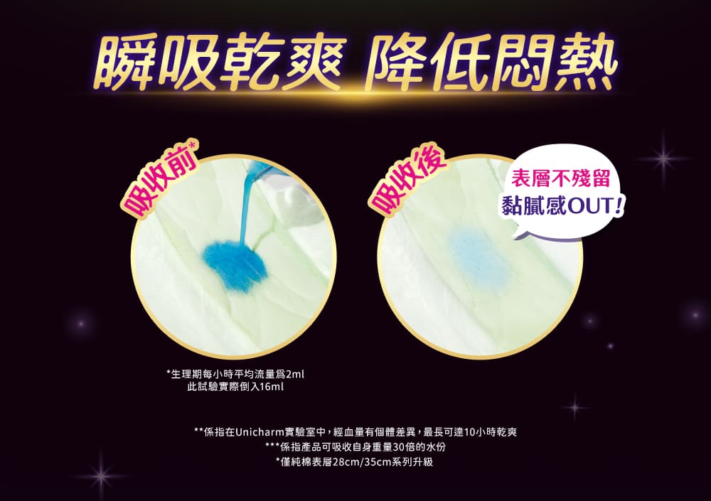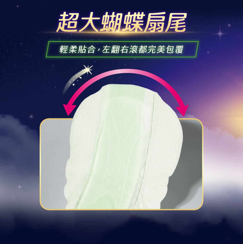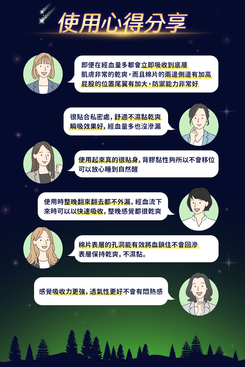使用起來肌膚舒適,棉片吸收力好表層乾爽,也很貼合身體不易漏,且有抑菌功能,晚上睡覺用很安心