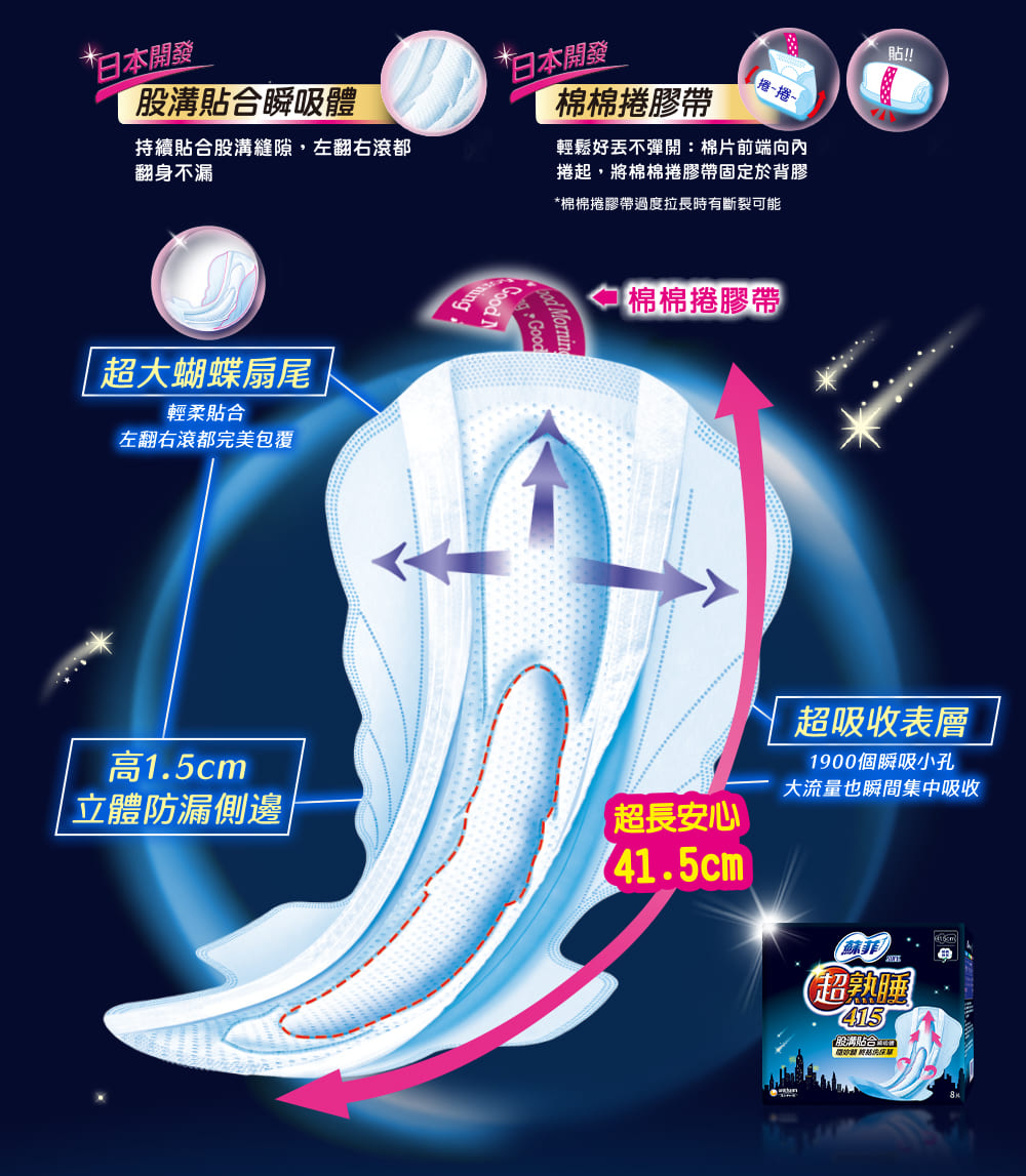 瞬吸效果好,大量經血也不回滲、不外漏,中間吸收體材質很柔軟貼身,包覆性好,舒適性佳